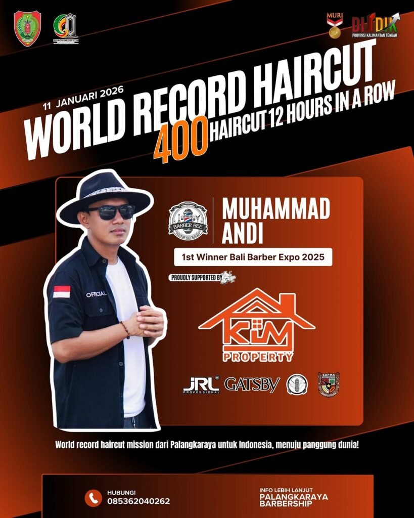 Palangka Raya – Denting mesin cukur tak lagi hanya bicara soal gaya rambut. Dari Palangka Raya, geliat industri barbershop berubah menjadi panggung ambisi besar, mencatat rekor yang belum pernah ada sebelumnya dan membawa nama daerah ke level dunia. Kegiatan ini rencana akan berlangsung pada Minggu, 11/1/26 berlokasi di Bundaran besar Palangka Raya selama 12 Jam.