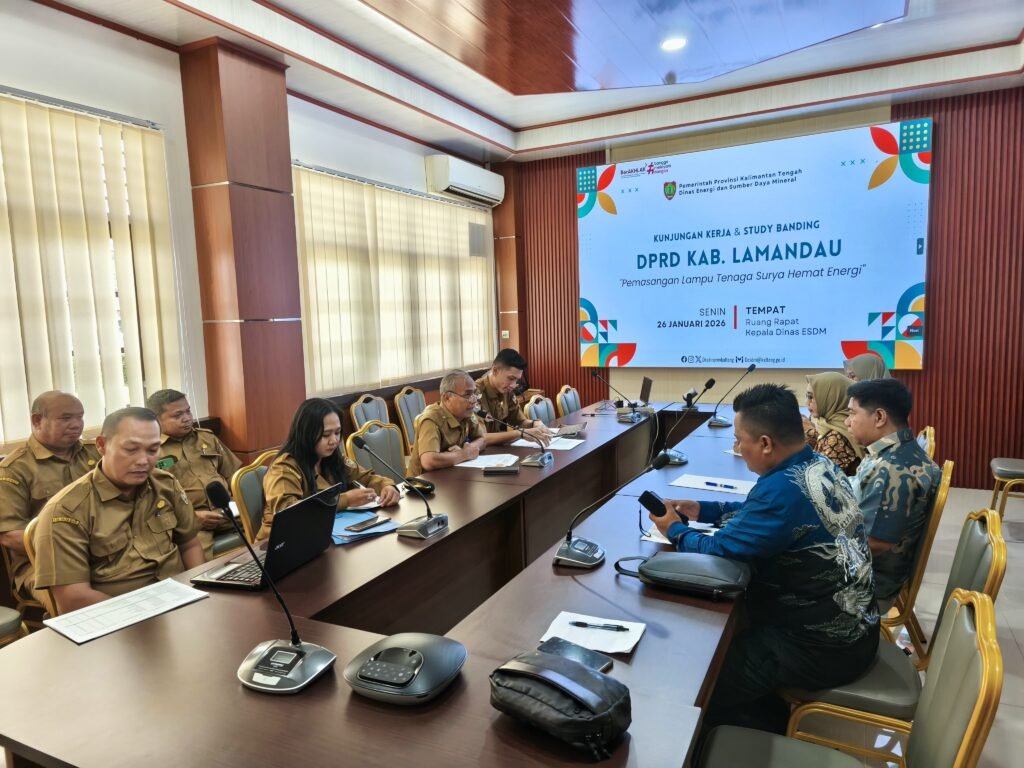 PALANGKA RAYA – Dinas Energi dan Sumber Daya Mineral Provinsi Kalimantan Tengah menerima Kunjungan Kerja dan Studi Banding dari DPRD Kabupaten Lamandau, Senin (26/1/2026). Kegiatan tersebut berlangsung di Ruang Rapat Kepala Dinas ESDM Kalteng.